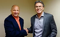 | Steve Smith, left, president of Enertech Global and incoming GEO chairman, gets congratulated by outgoing chairman Tom Huntington of WaterFurnace during the March 25 meeting. Source: GEO |