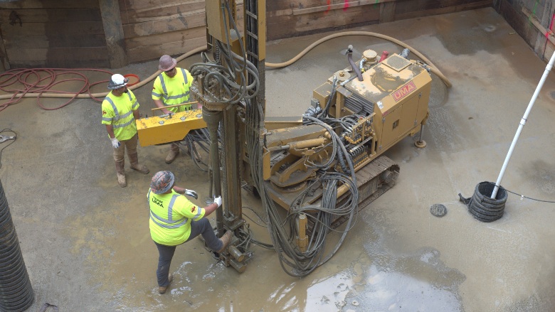 One of the visual spectacles on the project was Lakeshore Engineering using a crane with rigging to lower a Beretta T46 drilling rig into the excavation as UMA’s team provided direction.
