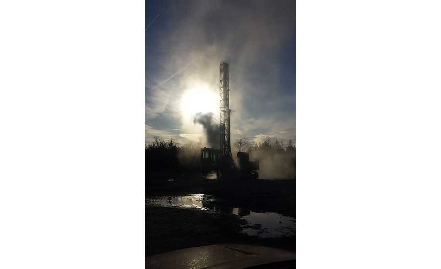 Two drilling rigs owned by Johnson Drilling install geothermal boreholes at the Whisper Valley net zero energy project in Austin, Texas.