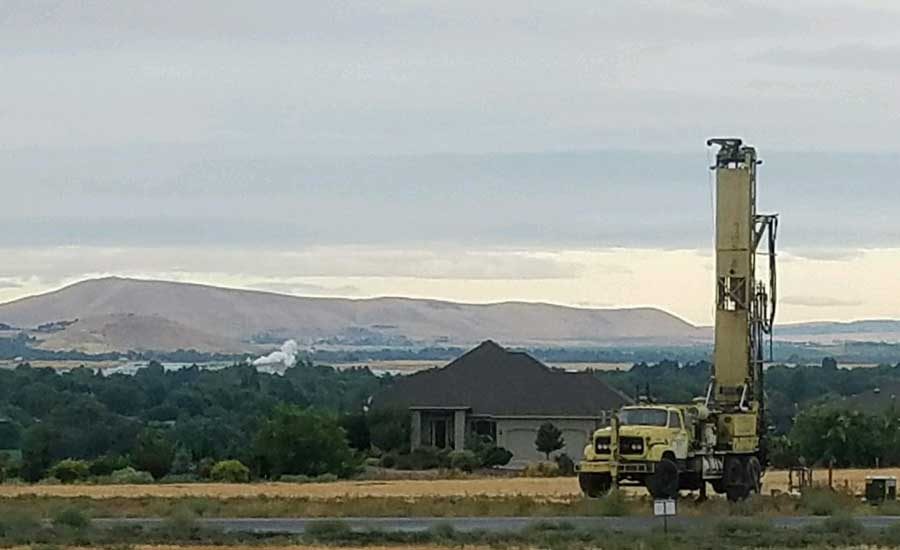 A rig with Statewide Well Drilling is set up for a 6-inch domestic water well project in Pasco, Wash.